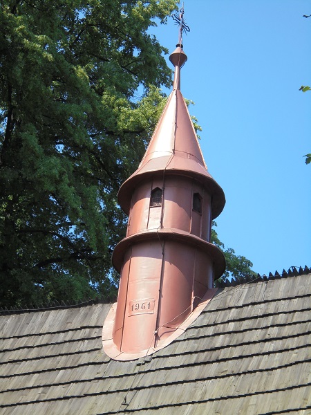 przy cmentarzu, wznosi się drewniana świątynia otoczona starodrzewiem.